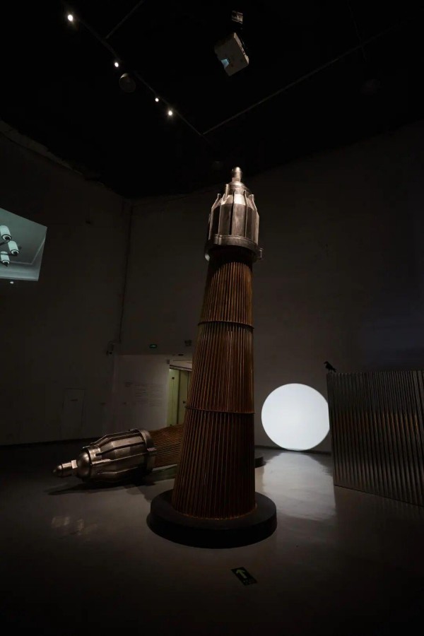 《烟波钓远》装置,2024年,黄铜管、铝板、青铜板、LED灯、喇叭,瓶胆碎片,700x350x500 尺寸可调
