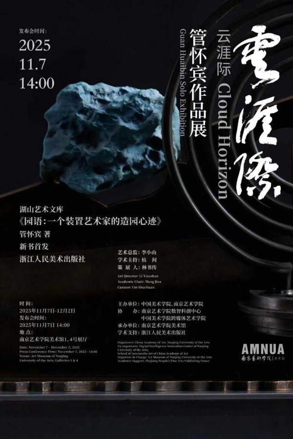 《云涯际:管怀宾作品展》由中国美术学院、南京艺术学院主办,南京艺术学院数智科创中心、中国美术学院跨媒体艺术学院协办,南京艺术学院美术馆承办。展览将展出管怀宾近期以“云涯际”为意象的装置作品、影像、方案手稿两百余件,是其艺术生涯的一次集中呈现。本次展览在南京艺术学院美术馆1、4号展厅展出,展期将持续至12月2日。